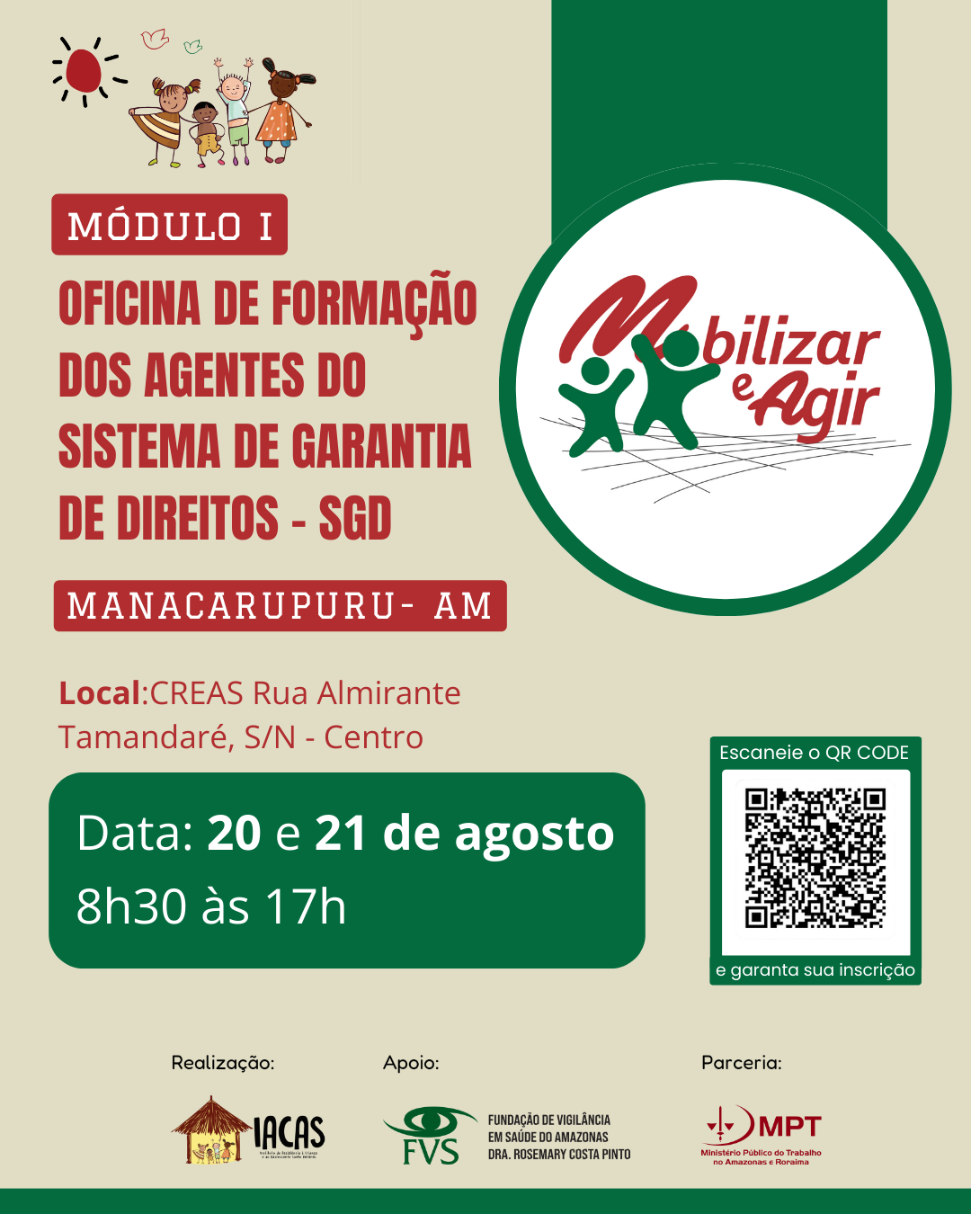 Nos dias 20 e 21 de agosto, o projeto Mobilizar e Agir, realizado pelo Instituto de Assistência à Criança e ao Adolescente Santo Antônio (IACAS), em parceria com o Ministério Público do Trabalho (MPT), realiza o 1º Módulo da Oficina de formação dos agentes do Sistema de Garantia de Direitos em Manacapuru. O objetivo é reunir profissionais e lideranças para trocar experiências e fortalecer a rede de proteção à infância e adolescência.